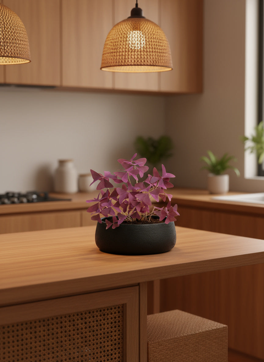 The Oxalis is a relatively easy plant to care for, as long as there is bright light. Just be sure to consistently rotate the plant for even growth on all sides. Watering it once a week is sufficient, allowing the top inch of soil to dry out between waterings. Don’t worry about underwatering as your Oxalis will not hesitate to show you that it needs water with droopy leaves.