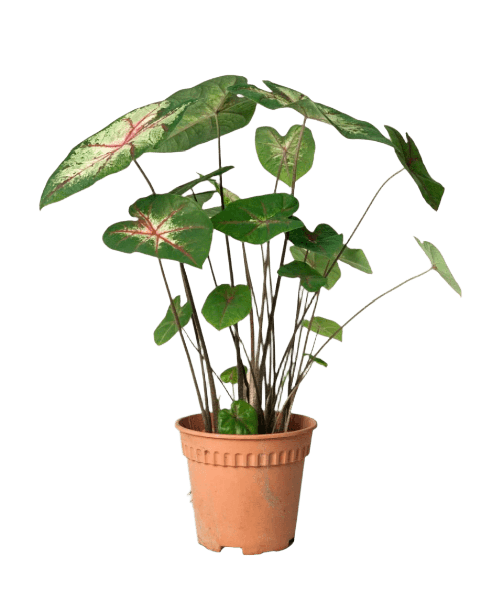 Caladium Cherry Blossom is a visually striking plant with pink and green variegated leaves. It requires indirect light and consistent moisture to thrive. This variety adds a touch of elegance to gardens and indoor spaces, but it should be placed out of reach of pets due to its toxicity.