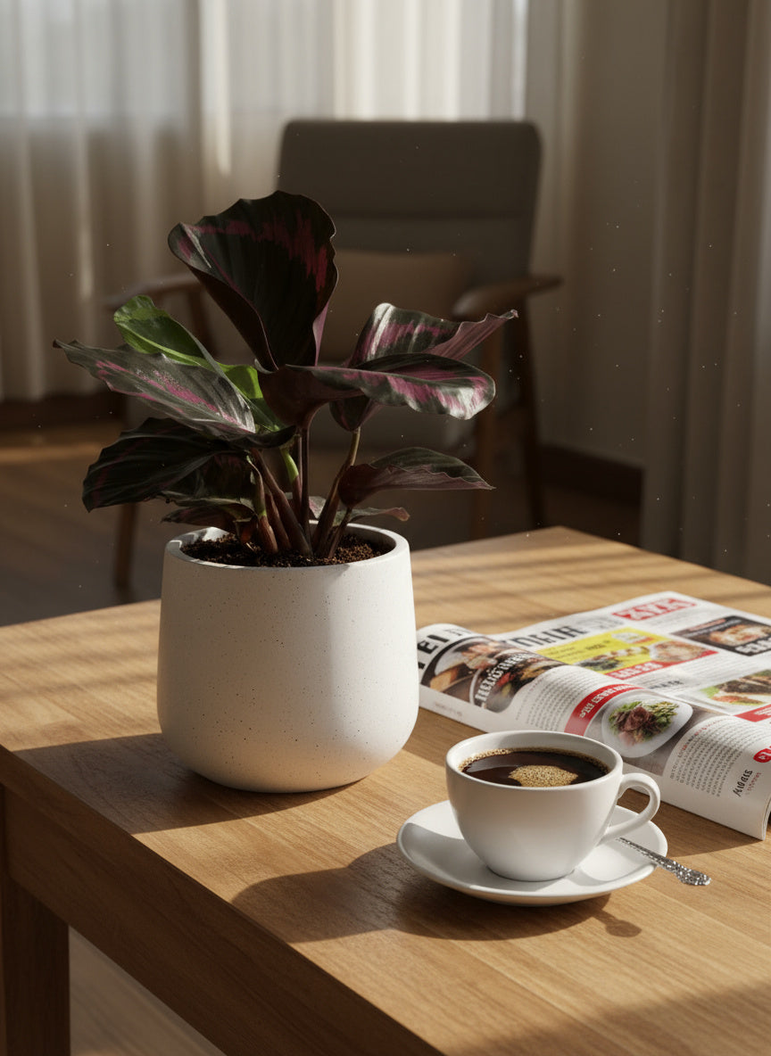 Introducing the captivating Calathea Roseopicta 'Purple,' a member of the Marantaceae family, native to the lush rainforests of Brazil. This exquisite plant boasts stunning purple leaves with delicate pink undertones, making it a standout addition to any indoor space. Ideal for Singapore's climate, it thrives in bright, indirect light and requires consistently moist soil with good drainage. Recognized for its air-purifying qualities, the Calathea Roseopicta 'Purple' not only enhances your decor but also contributes to a healthier living environment. With its pet-friendly nature and moderate care requirements, this Calathea is a perfect choice for plant enthusiasts seeking a touch of elegance and tropical charm. Elevate your indoor oasis with the alluring beauty of the Calathea Roseopicta 'Purple.'