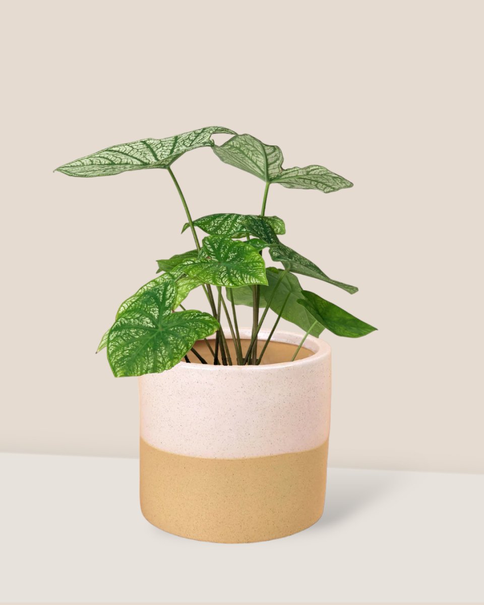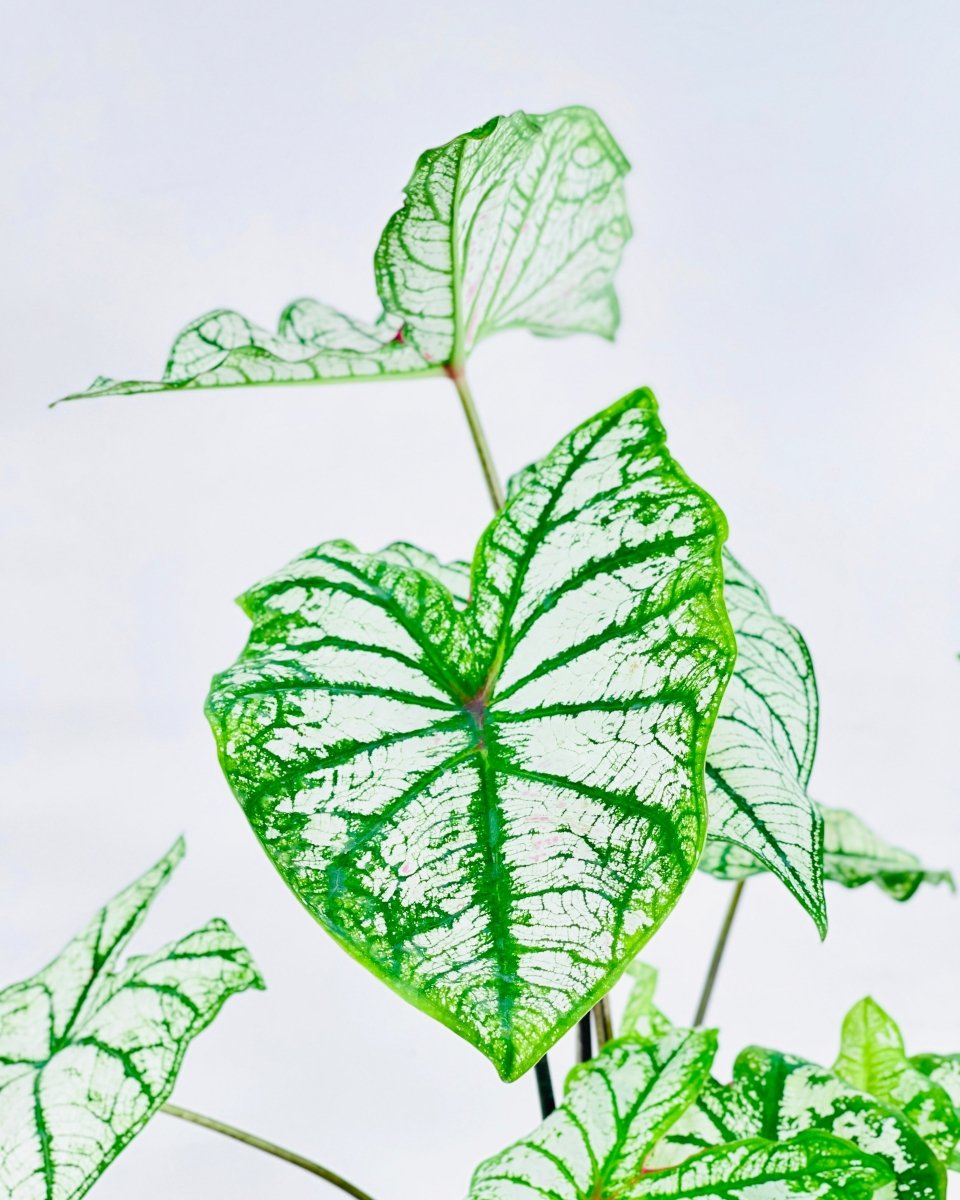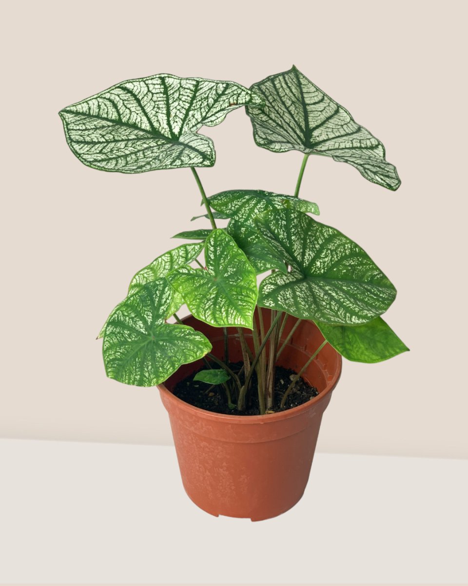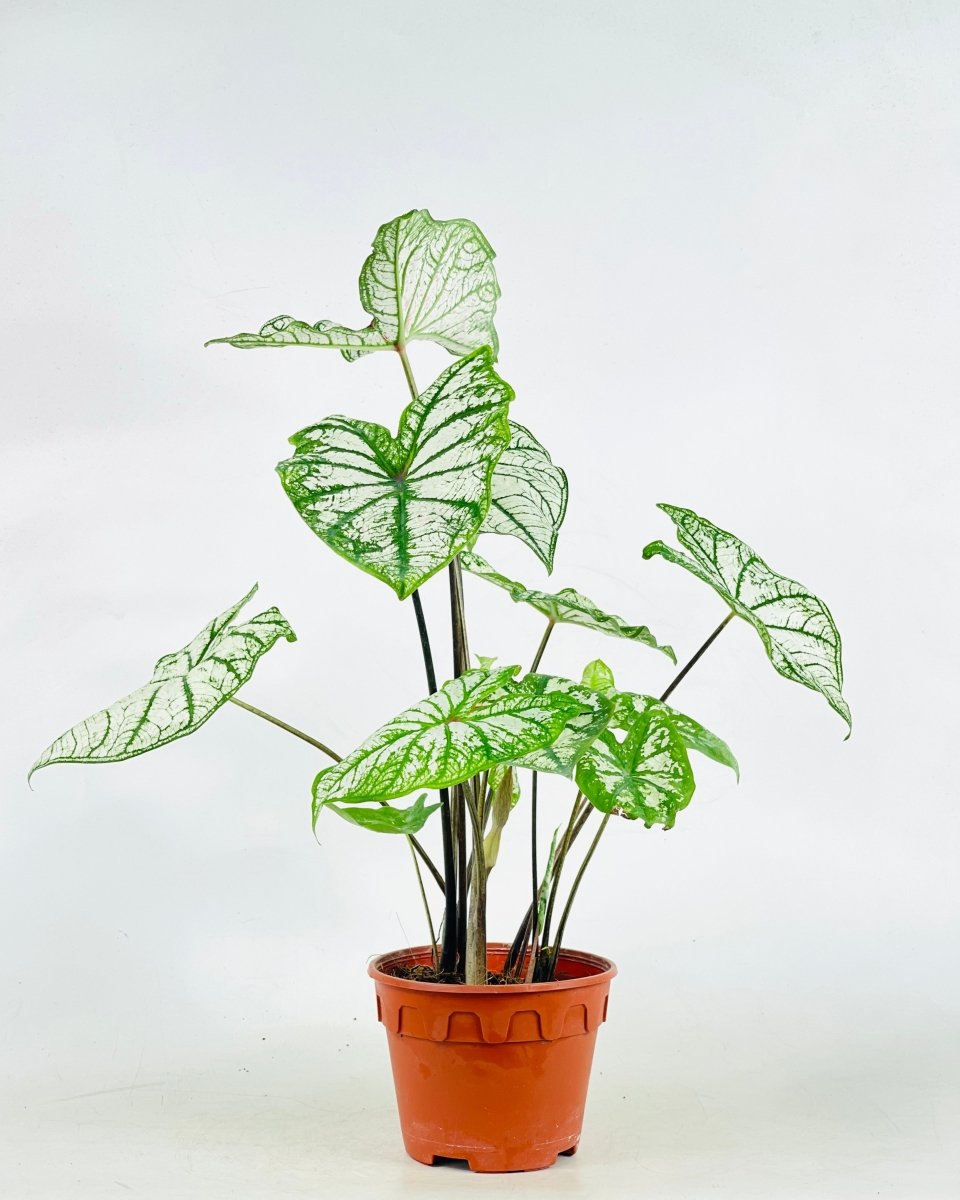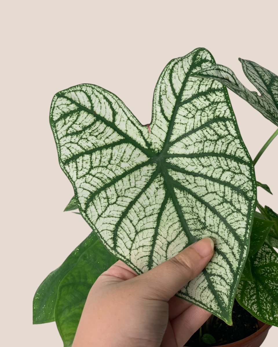 Caladium White Christmas is a stunning variety of caladium known for its white and green leaves. It thrives in partial shade and requires consistently moist soil. Avoid direct sunlight, as it can scorch the delicate leaves. Caladiums are perfect for adding a tropical vibe to your indoor or outdoor space, but be cautious around pets, as they can be harmful if eaten.