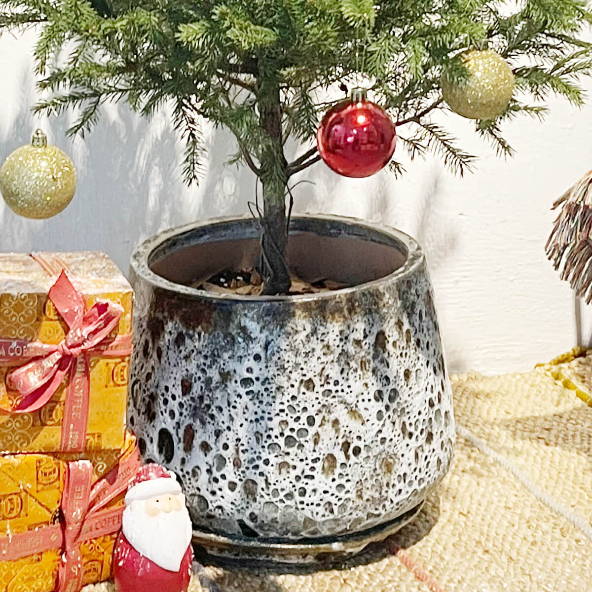Tiny Tim Christmas Tree comes with a large cement terrazzo planters - Brown Moon Pot with tray. The size of planter is 30cm(H) X 30cm (W), and the internal diameter at rim is 20.5cm.