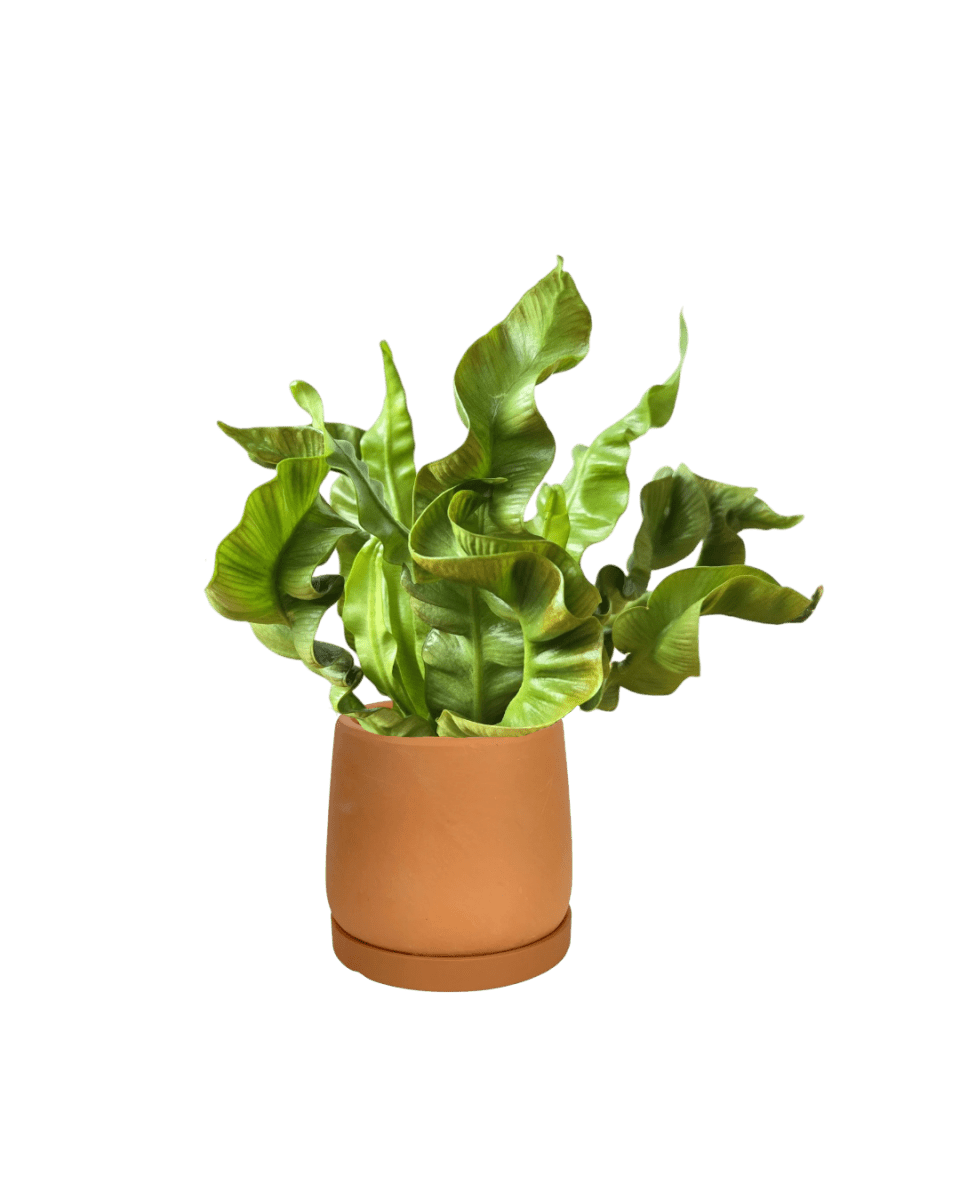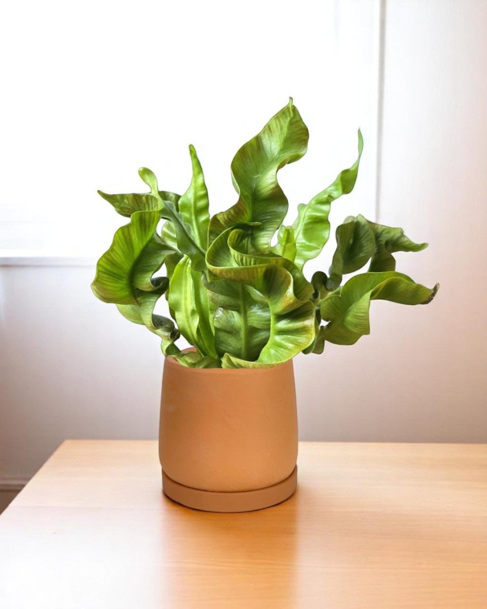 The Bird’s Nest Fern is a relatively easy plant to care for. It prefers consistently and evenly moist, but not soggy, soil. Water about once or twice a week, making sure that excess water is drained to prevent root rot. Ferns thrive in moderate to bright indirect light. Make sure that it is not exposed to direct sunlight as it will scorch the leaves.