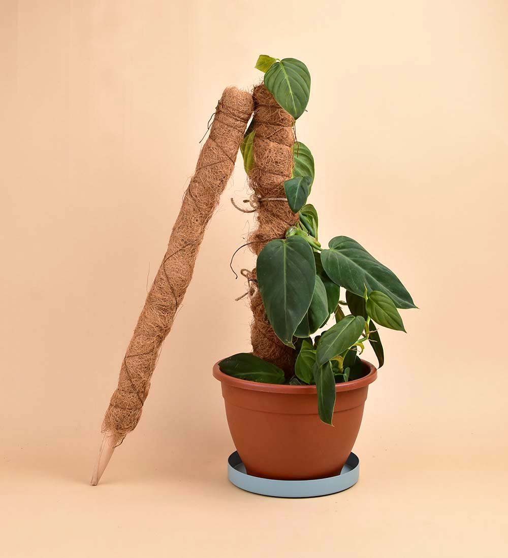 Grow poles provide a support structure for creeping plants or other plants with long stems, helping the plant avoid becoming too flat and spread out and keeping leaves from touching the floor. The wooden poles are wrapped in coconut coir, which is an efficient growing medium for plants, retaining moisture and nutrients that can help the plant's development.