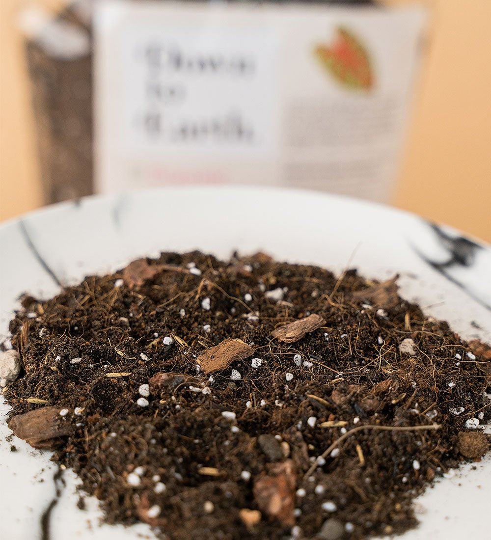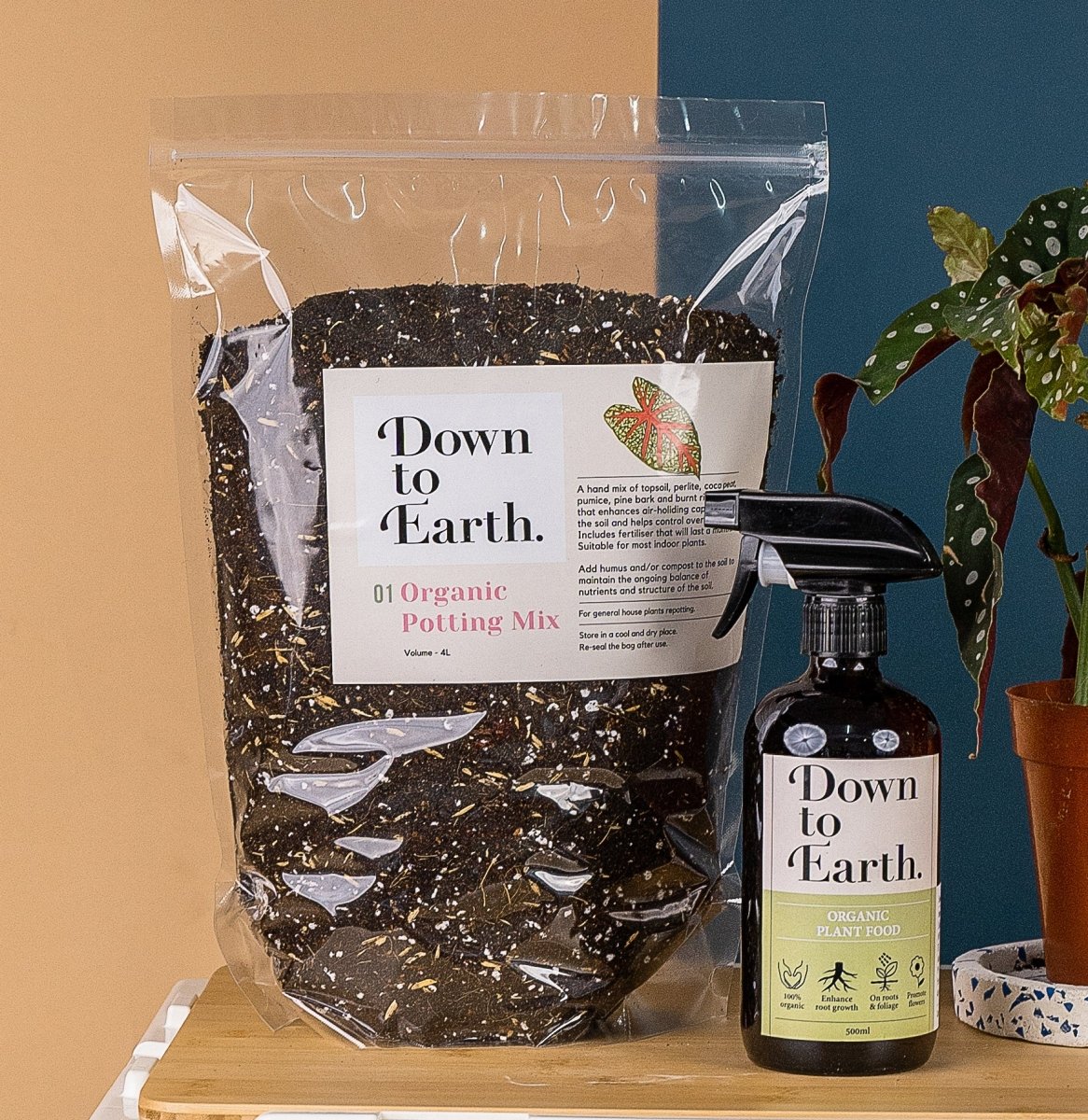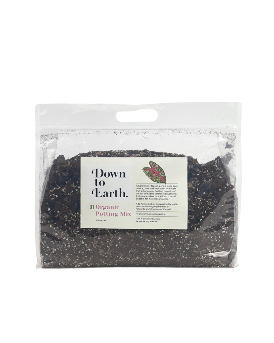 Down to Earth. Organic Potting Mix 01 is a hand mix of topsoil, perlite, coco peat, pumice, pine bark and burnt rice husks that enhances air-holding capacity of the soil and helps control overwatering. Includes fertiliser that will last a month.