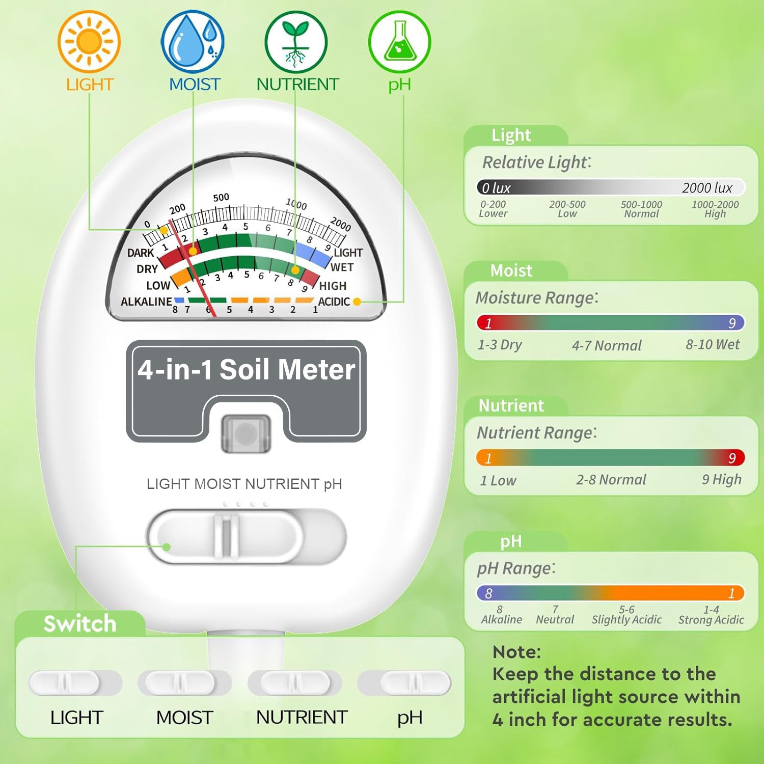 - 4-in-1 multifunction design for light, moisture, nutrient, and pH testing.