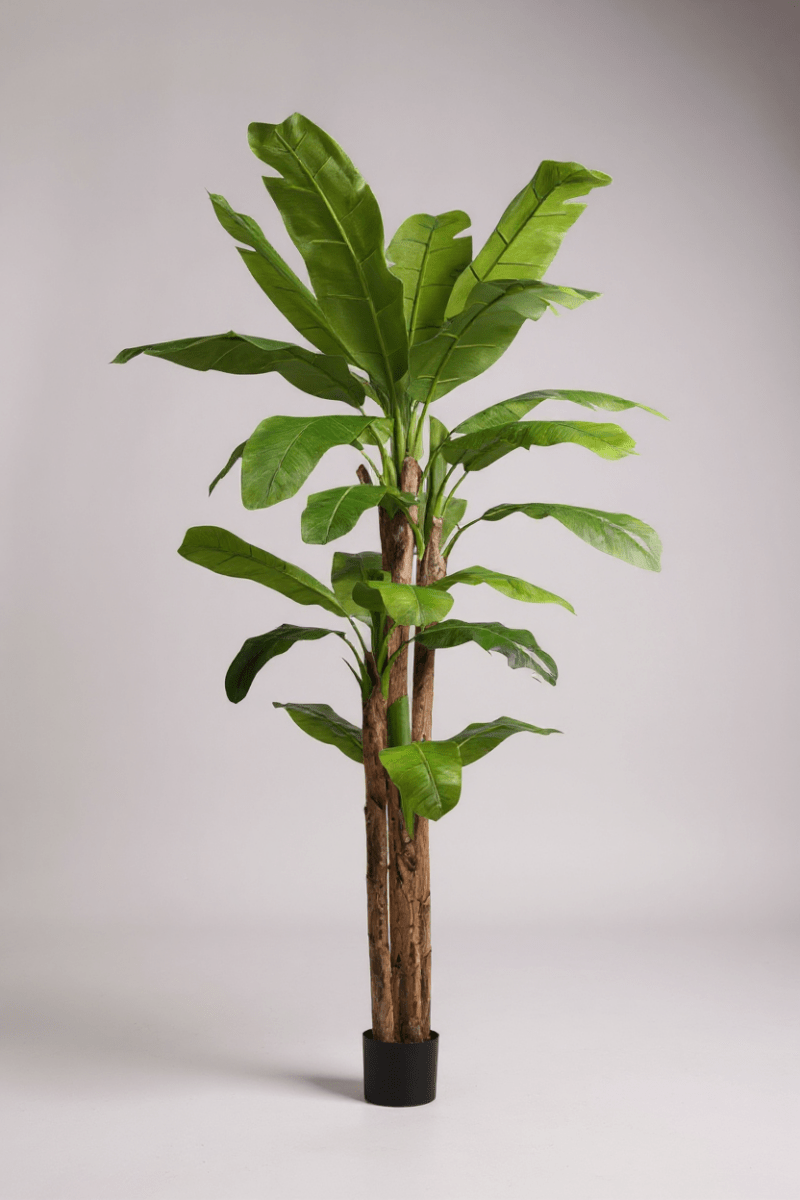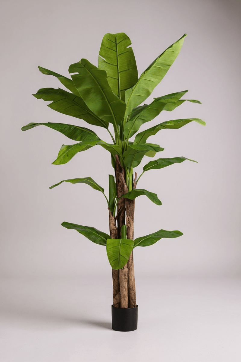Enhance your indoor or outdoor space with this artificial banana tree, designed to bring a touch of nature to your home without the hassle of maintenance. Crafted with precision, it features vibrant green leaves and a realistic trunk wrapped with natural bark, making it almost indistinguishable from a real banana plant. Made with export-grade materials that are environmentally friendly and non-toxic, this artificial tree guarantees safety and durability. Whether placed in your living room, office, or patio, this stunning plant adds a tropical charm and an aesthetic boost to any setting.