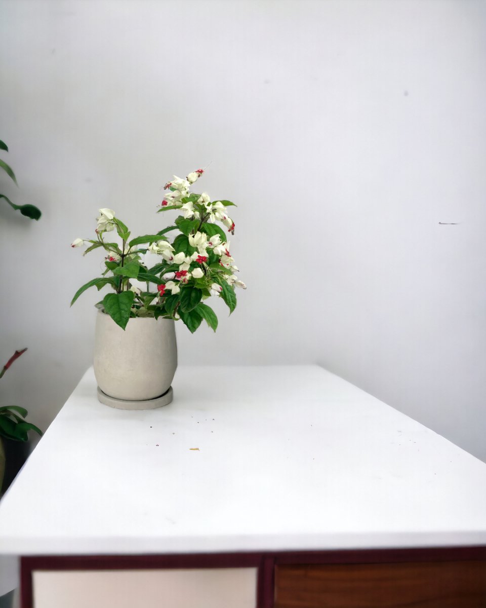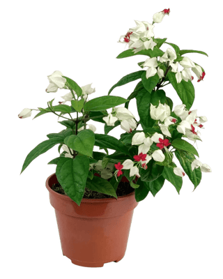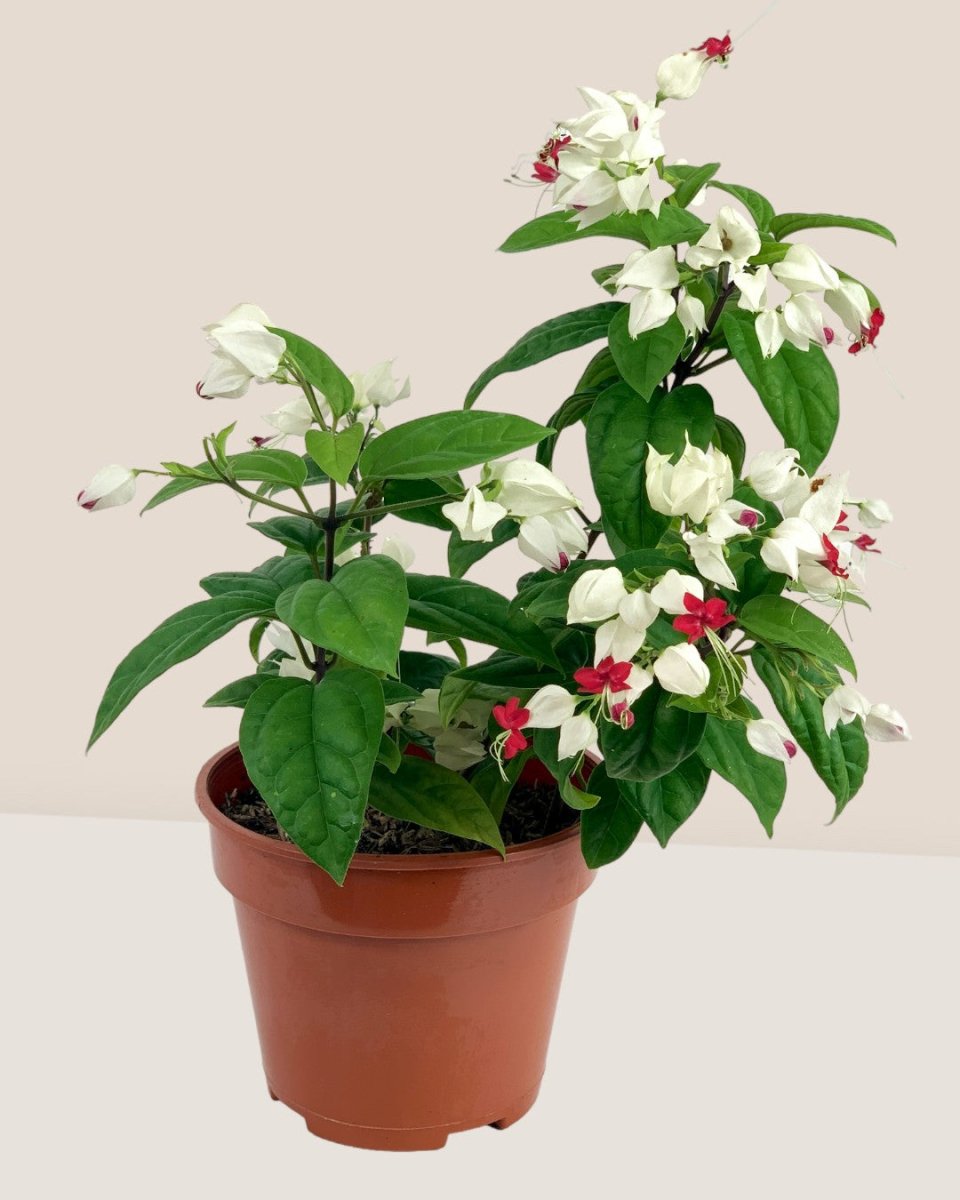 The Clerodendrum Batik, or Bleeding Heart Vine, is an enchanting tropical plant with distinctive red and white heart-shaped blooms. Belonging to the mint family and originating from West Africa, this vine thrives in Singapore's tropical climate. Place it in bright, indirect light for optimal growth. Care is straightforward: keep the soil consistently moist, trim occasionally for shape control, and apply balanced liquid fertilizer during the growing season. It prefers warm temperatures and dislikes overwatering or exposure to cold drafts. Enhance your living space with this easy-to-care-for plant, adding a tropical touch and vibrant atmosphere. Pet-friendly and adaptable, the Bleeding Heart Vine suits both novice and experienced plant enthusiasts, bringing exotic charm to your home.