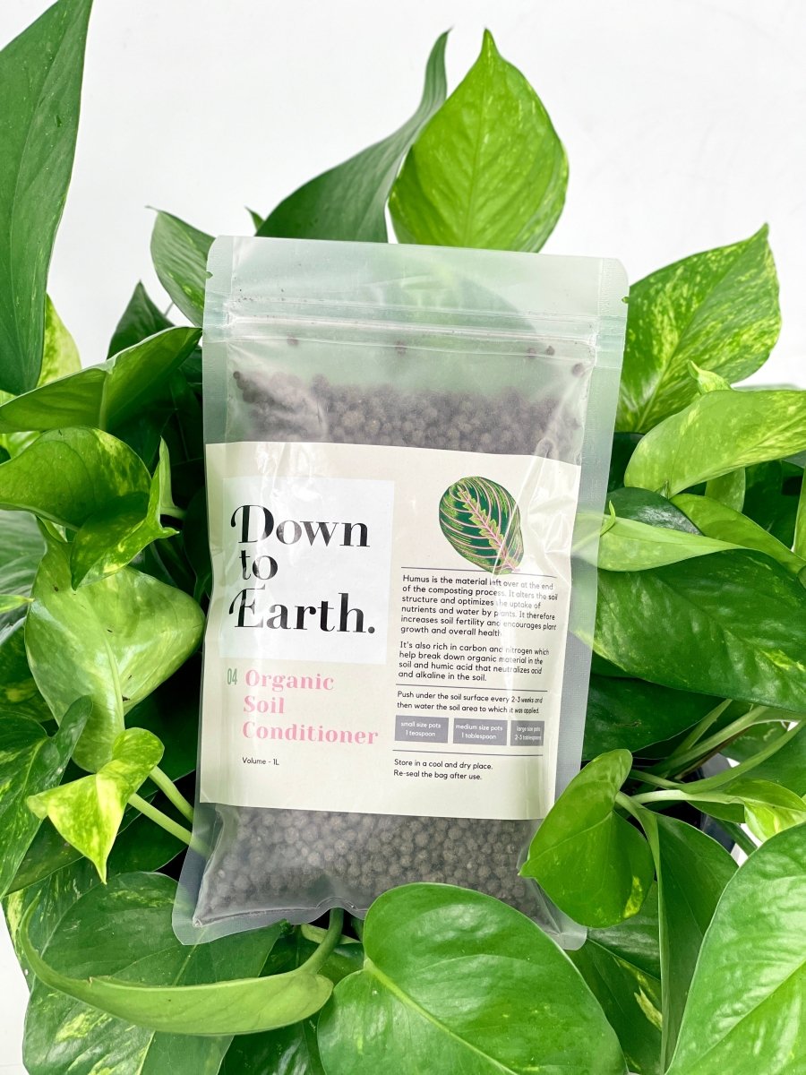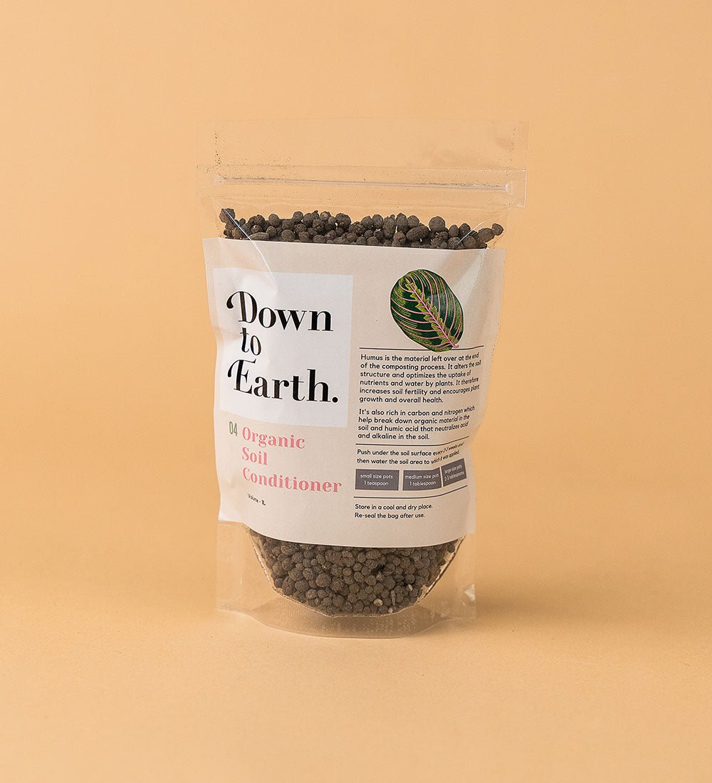Down to Earth. Organic Soil Conditioner 04 uses humus, which is the material left over at the end of the composting process. It alters the soil structure and optimises the uptake of nutrient and water by plants. It therefore increases soil fertility and encourages plant growth and overall health.