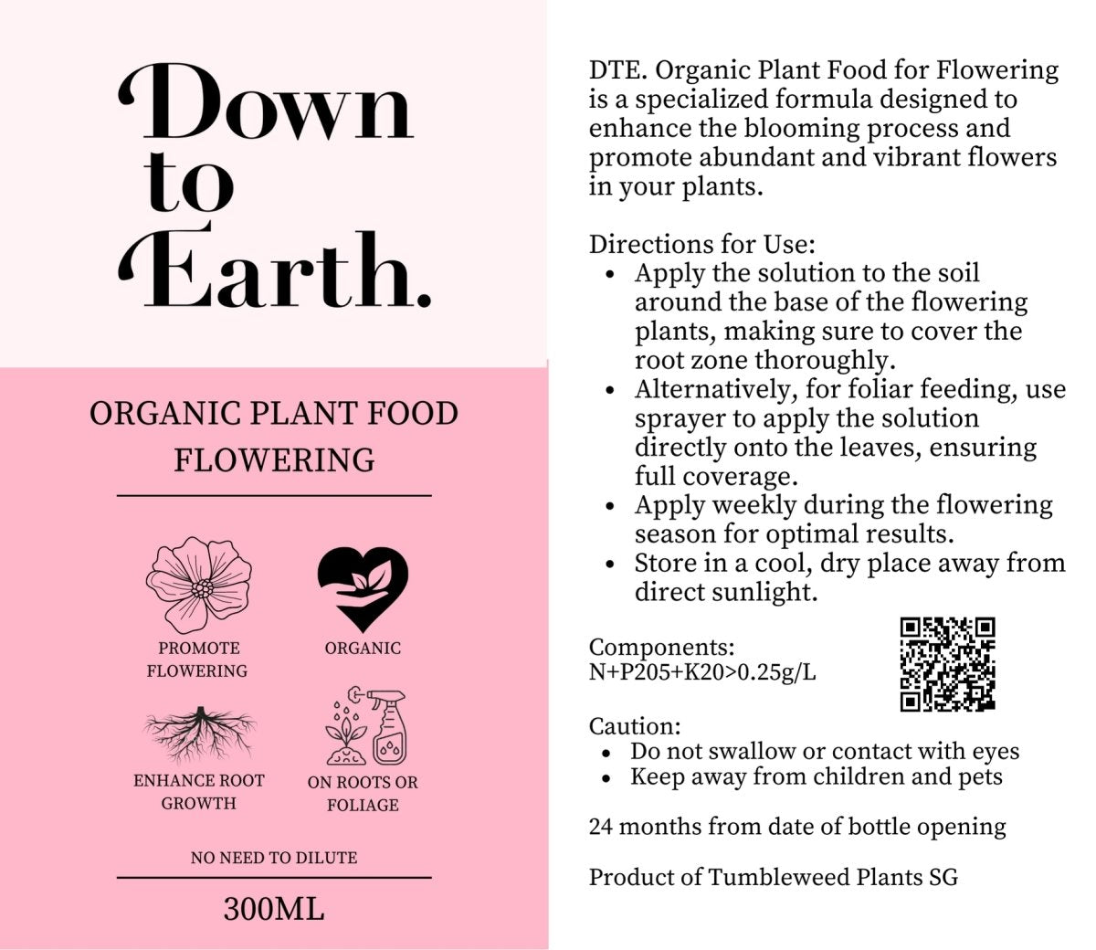 Down to Earth. Organic Plant Food for Flowering is a specialized formula designed to enhance the blooming process and promote abundant and vibrant flowers in your plants. Whether you have a flower garden, potted plants, or indoor blooms, this plant food provides essential nutrients and minerals that support healthy flowering and long-lasting blossoms.