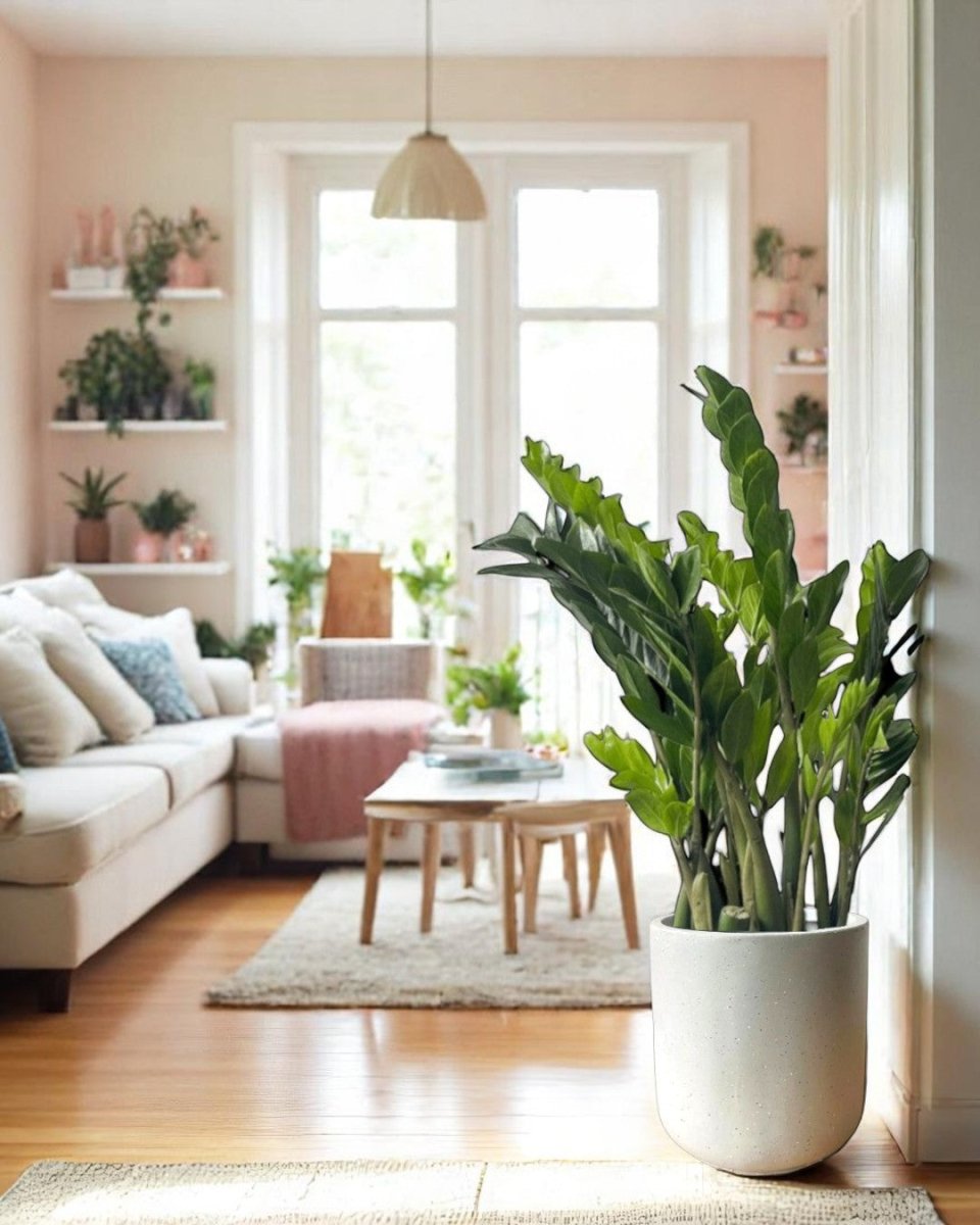 Care for ZZ plant is simple and basic. Place it in low to bright indirect light and only water when it’s fully dry, usually once every two weeks.