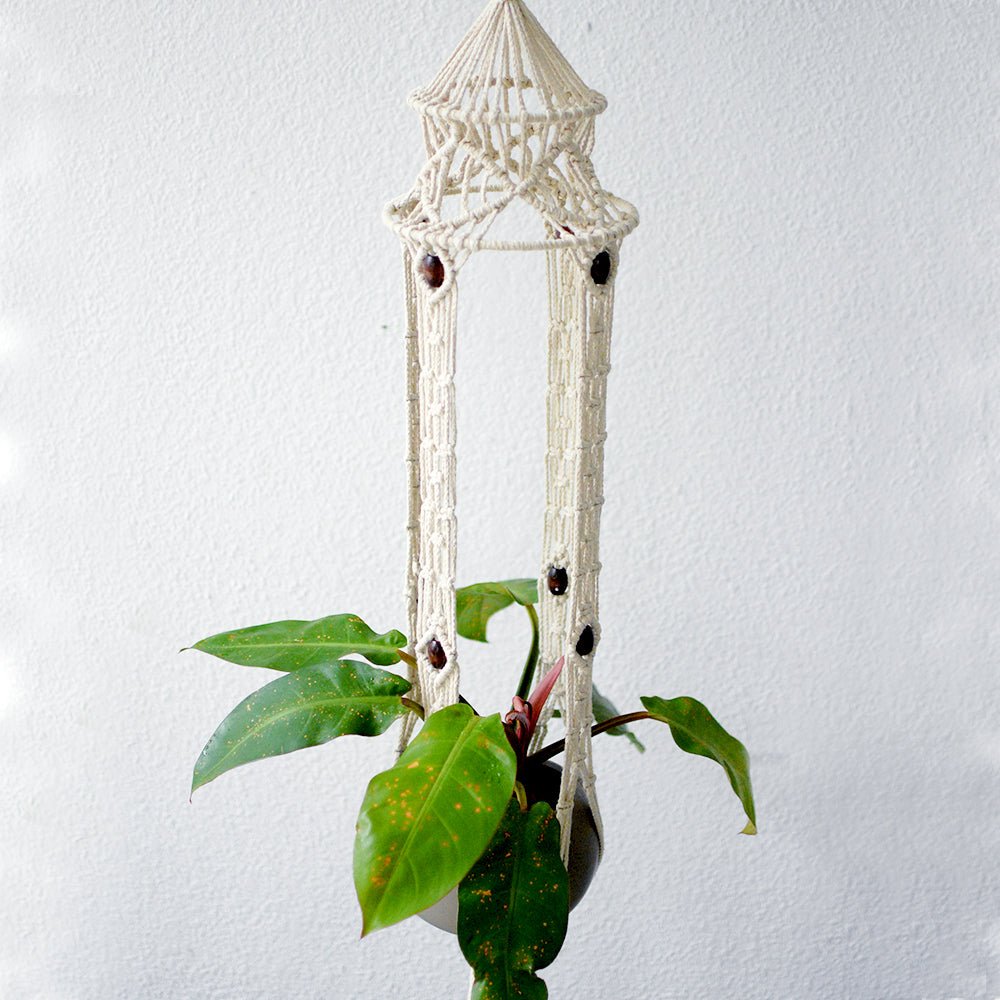 This standout Morroccan style macramé hanger makes the dullest of plants look like a sultan! A gazebo style hood, beaded design and wide bottom offer elegance and practicality.