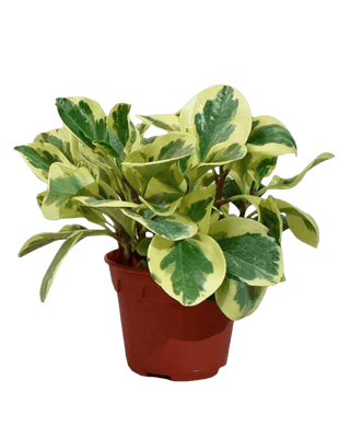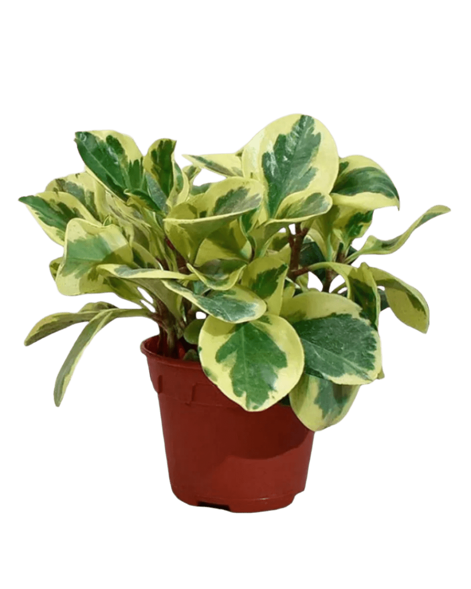 Popular and very easy to look after, this medium-sized houseplant is a variegated version of the Baby Rubber Plant. It is a bushy, up-right growing plant with thick stems and glossy light-coloured cream and green variegated leaves.