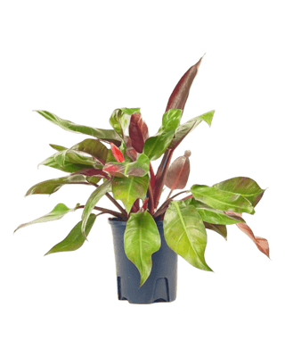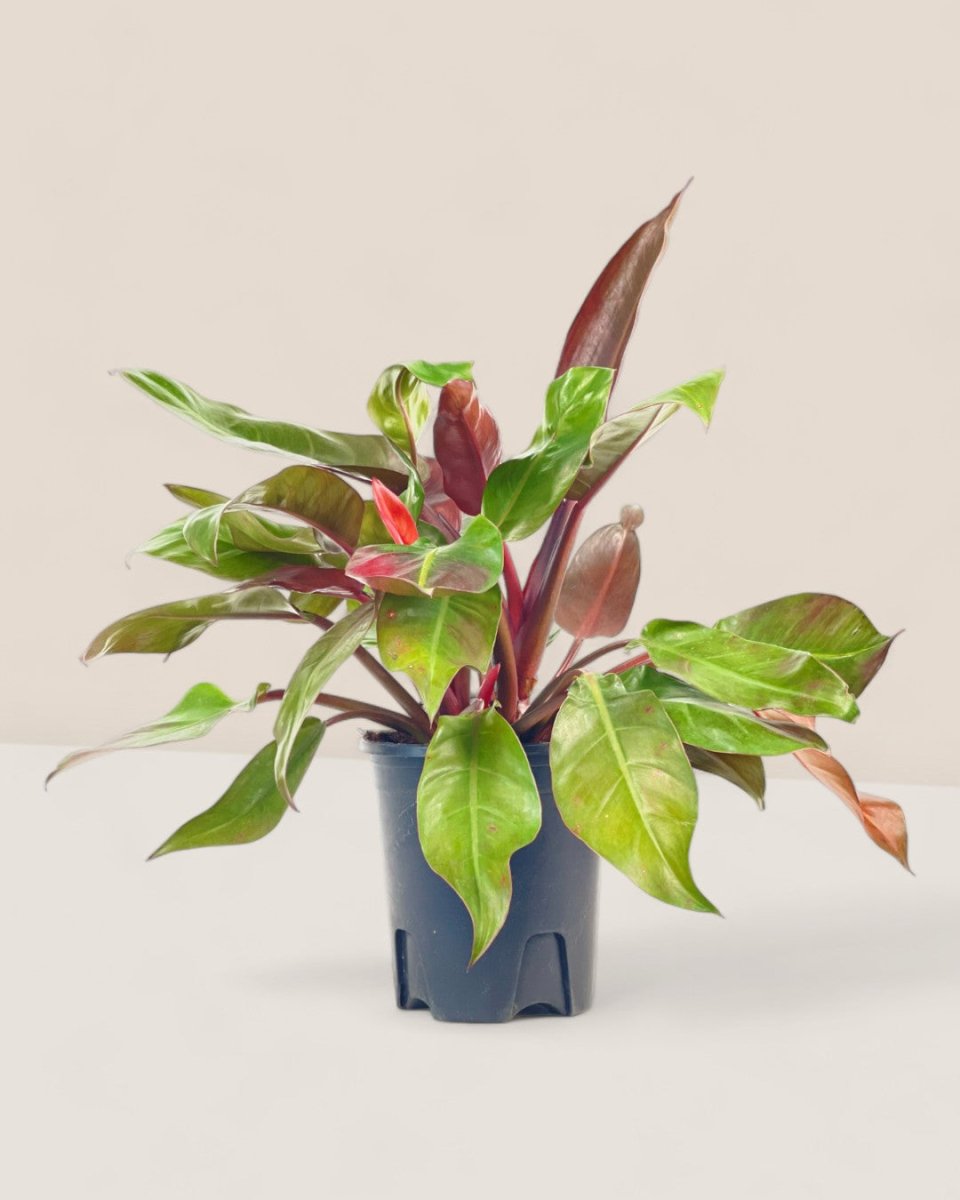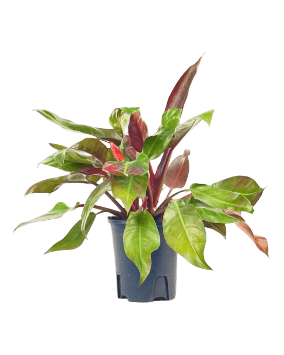 The Philodendron Red Sun boasts a captivating color journey, with its leaves transitioning from bright red in youth to a stunning blend of burgundy, orange, purple, and green as they mature.