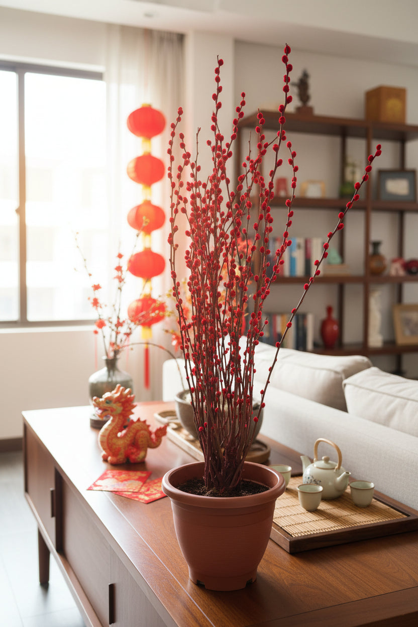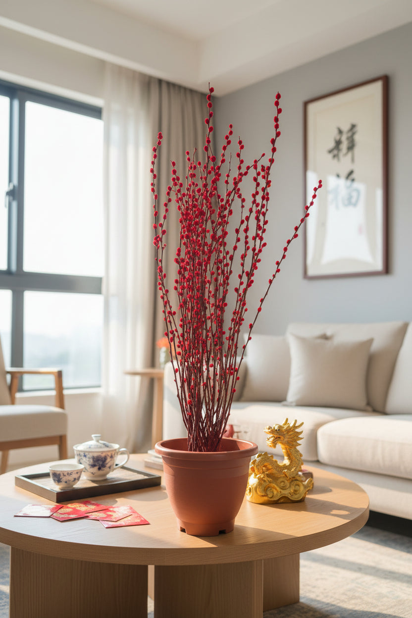 A striking Lunar New Year favourite with tall, elegant stems and vibrant coloured buds. Pussy Willow symbolises renewal, growth, and rising fortune—a refined festive accent that works beautifully in modern or traditional spaces.