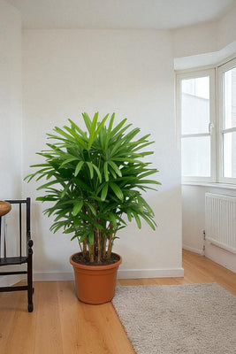 The Raphis Palm (Rhapis excelsa), also known as the Lady Palm, is a graceful and hardy ornamental plant from the palm family (Arecaceae). Originating in Southern China and Taiwan, it is prized for its elegant fan-shaped foliage and strong air-purifying abilities. This plant thrives in bright, indirect light but adapts well to low-light indoor spaces, making it perfect for homes and offices. In Singapore’s tropical climate, it requires watering 2–3 times per week, with the soil kept lightly moist but never soggy. Indoors under air conditioning, watering once a week is sufficient. The Raphis Palm is an easy-to-care-for plant that enjoys humidity, well-draining soil, and good air circulation. It dislikes direct harsh sunlight and waterlogged roots. Being pet-friendly and resilient, it is an excellent choice for anyone seeking a stylish, low-maintenance plant that improves indoor air quality.