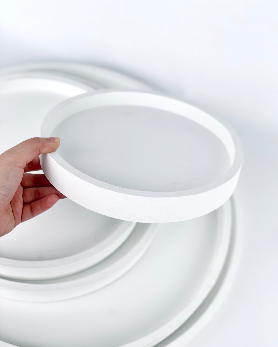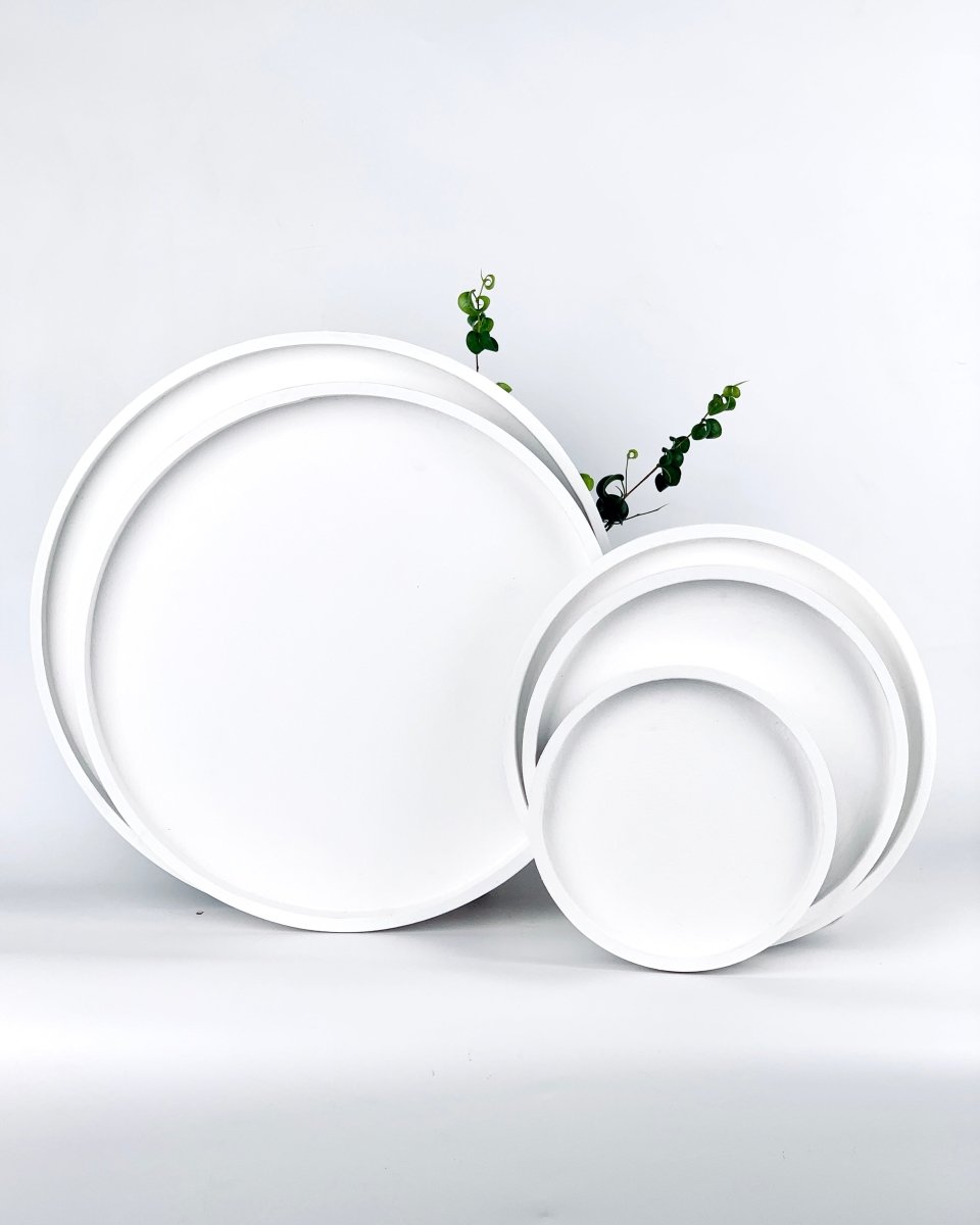 These resin water trays offer variety and flexibility. They have a white finish that matches most planter designs and they come in a variety of sizes to fit from mini to large sized planters. They have a slightly tapered rim, so please check the maximum pot base width dimensions to check the applicable size before ordering.