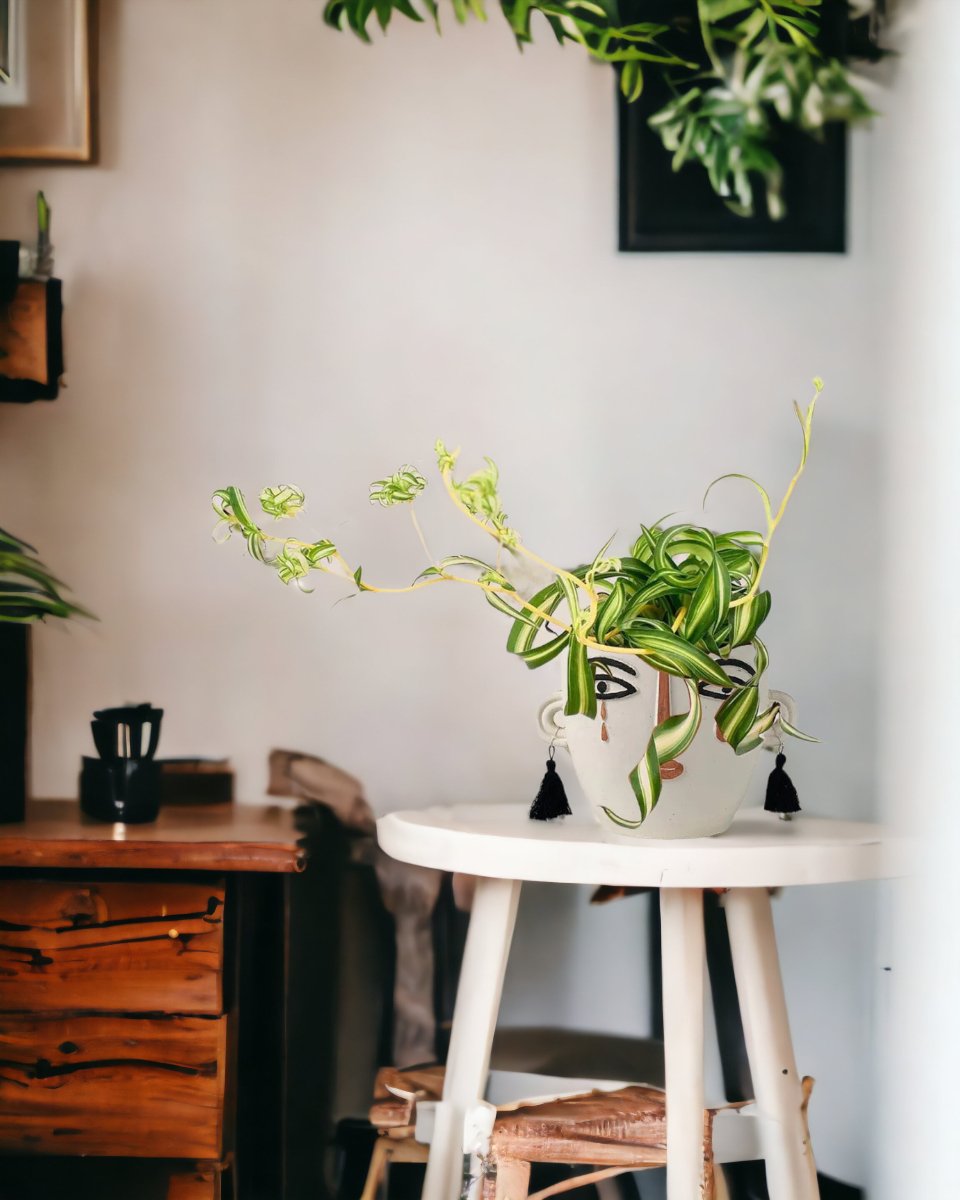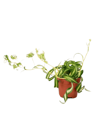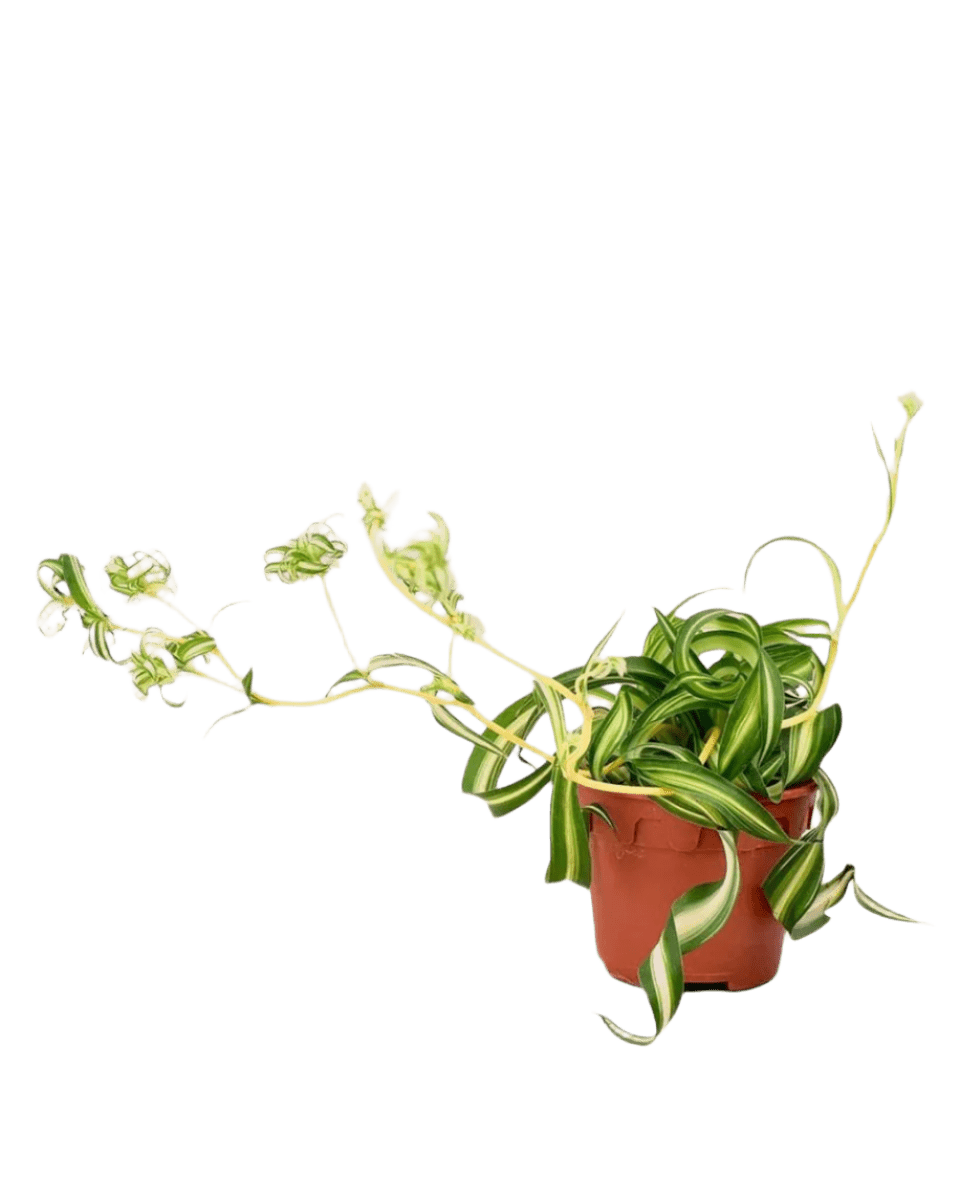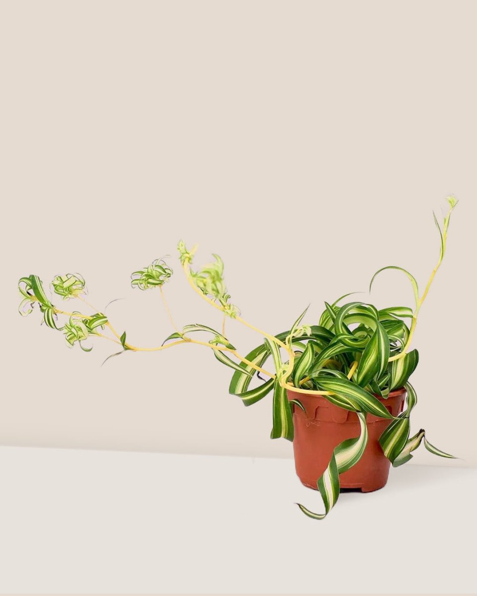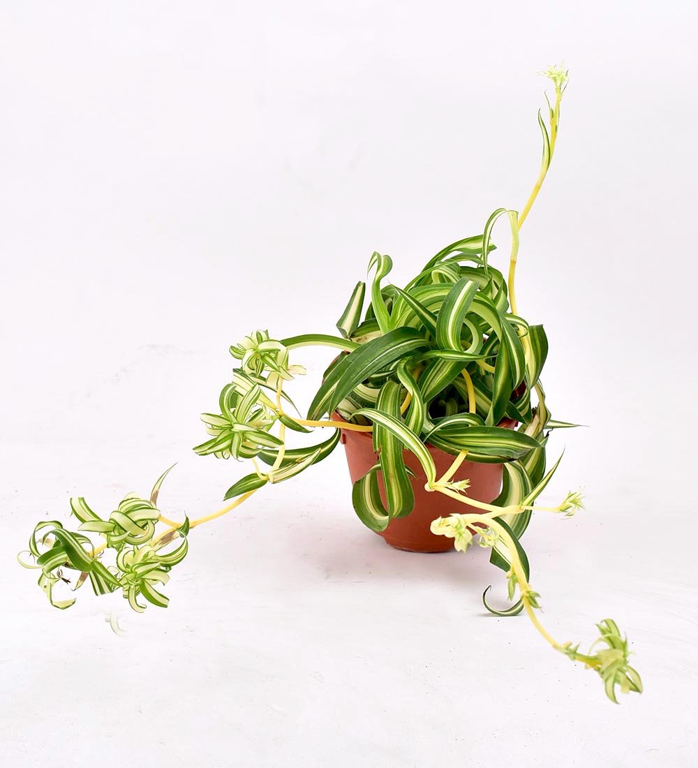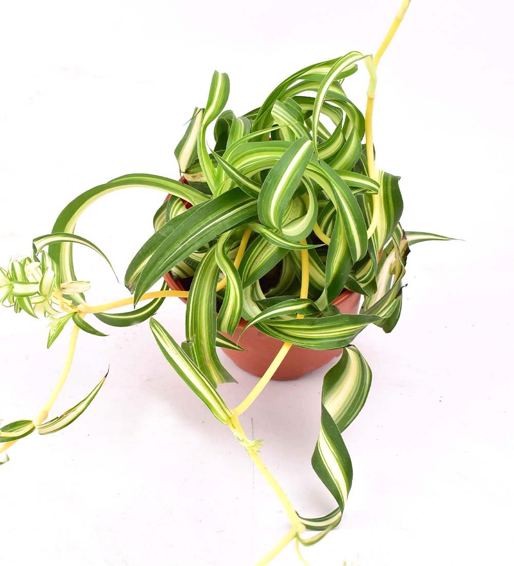The Spider Plant 'Bonnie' is a funky looking modern variant of the traditional Spider Plant. It features linear foliage that are striped green and yellowy-white which twist and curl along themselves, giving the plant a vibrant, playful look.