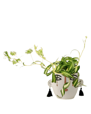The Spider Plant 'Bonnie' is a funky looking modern variant of the traditional Spider Plant. It features linear foliage that are striped green and yellowy-white which twist and curl along themselves, giving the plant a vibrant, playful look.