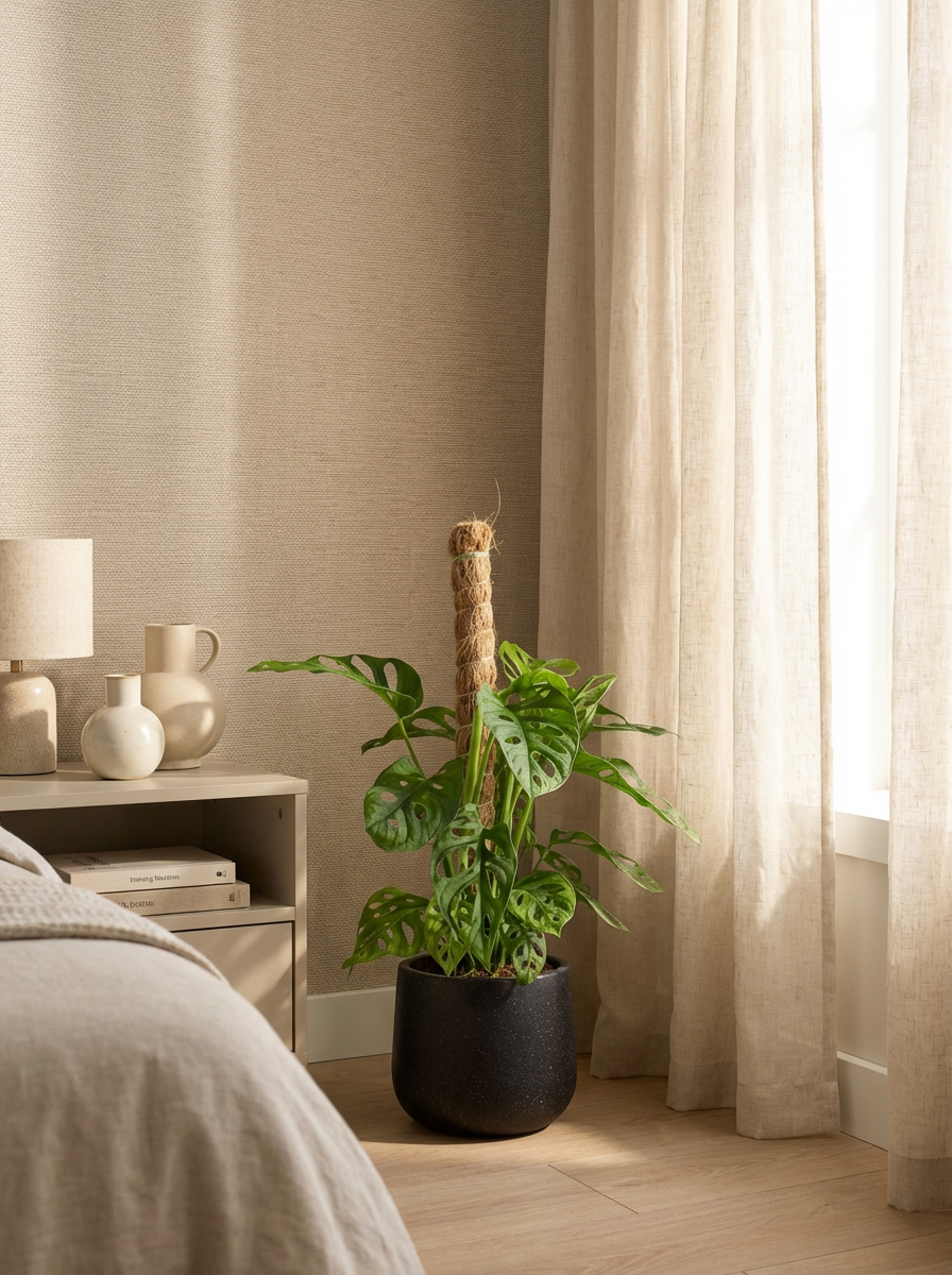 The Swiss Cheese Plant (Monstera deliciosa) in a grow pole is a stunning addition to any indoor space, known for its large, fenestrated leaves that add a tropical vibe to your home. Belonging to the Araceae family and native to the lush rainforests of southern Mexico and Central America, this plant thrives in bright, indirect light. In Singapore’s humid climate, it’s best to water your Monstera once a week, ensuring the soil remains moist but not soggy, with the top inch of soil drying out between waterings. This easy-to-care-for plant not only beautifies your space but also purifies the air, making it a healthy choice for your home. However, keep in mind that it is toxic to pets if ingested. The Swiss Cheese Plant enjoys a warm, humid environment and dislikes direct sunlight, which can scorch its leaves. With proper care, your Monstera will continue to grow and delight with its iconic, split leaves.