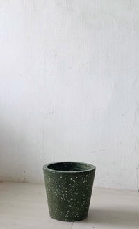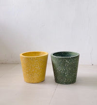 Cement terrazzo conical pots with beautifully coloured terrazzo pieces. These planters come in black, golden-yellow and olive-green colour tones.
